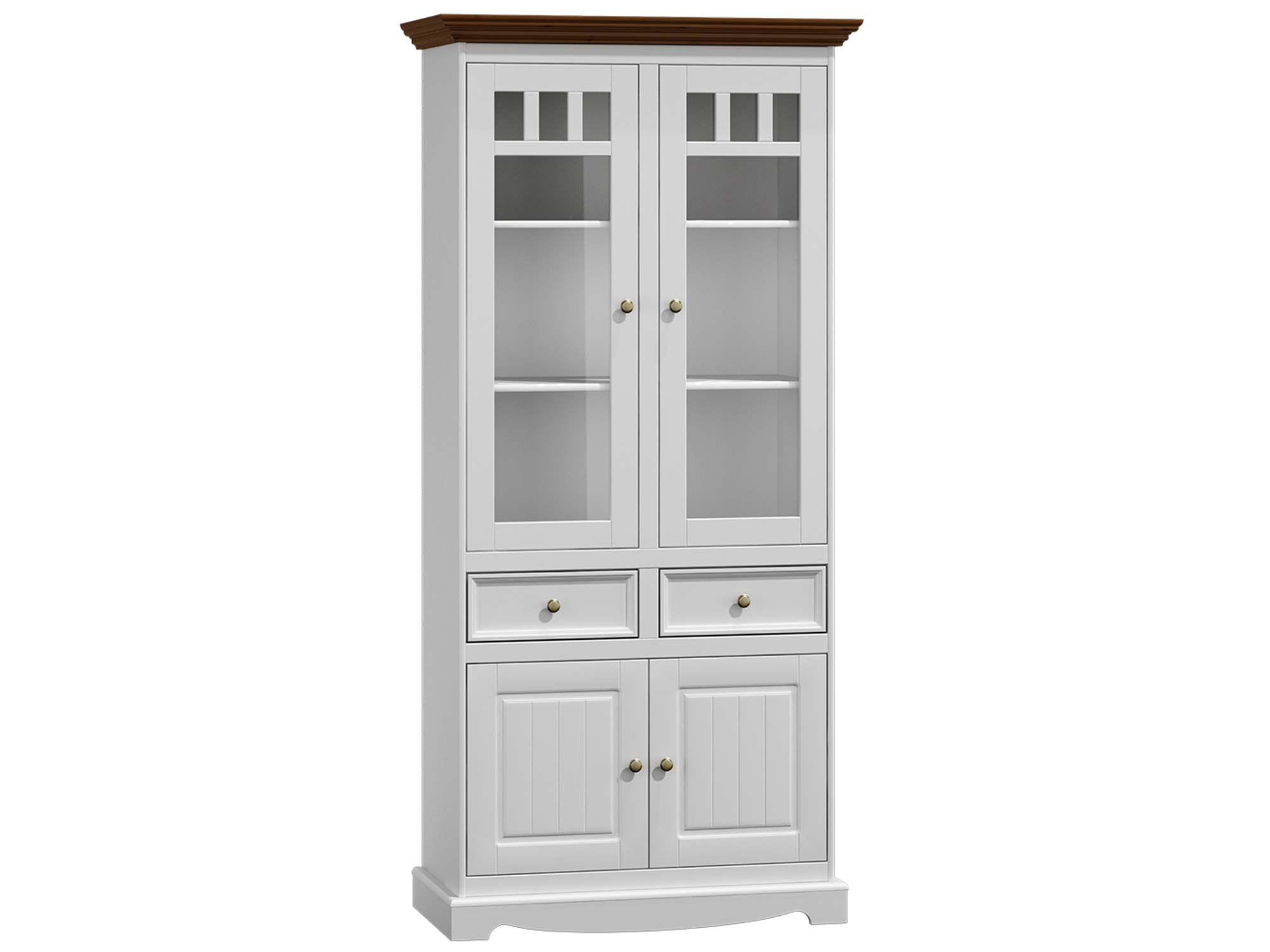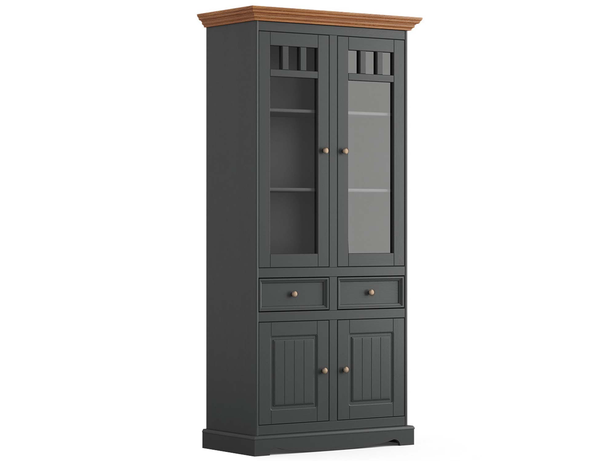 Prezentowana drewniana witryna w stylu prowansalskim INGRID dostępna jest w kilku wersjach kolorystycznych. Zaczynając od klasycznego odcienia bieli w całości, co sprawdzi się w znacznej większości wnętrz o charakterze klasycznym, kończąc na odważnym połączeniu grafitu z sosnowymi blatami. Zdecydowanie jest to wariant dla osób ceniących niekonwencjonalne rozwiązania we wnętrzu. Ponadto różnorodność w wybarwieniu zarówno korpusu jak i wieńca pozwala na stworzenie kreatywnego i unikalnego jak i prostego wnętrza. Z tego względu z pewnością każdy znajdzie wariant dopasowany do swojego gustu.