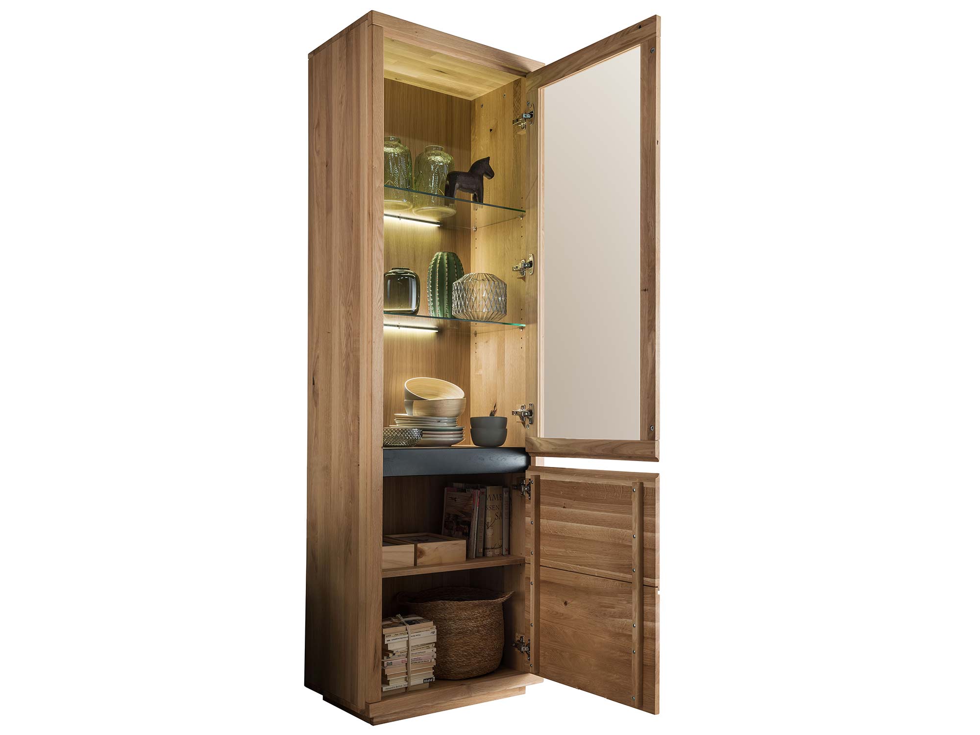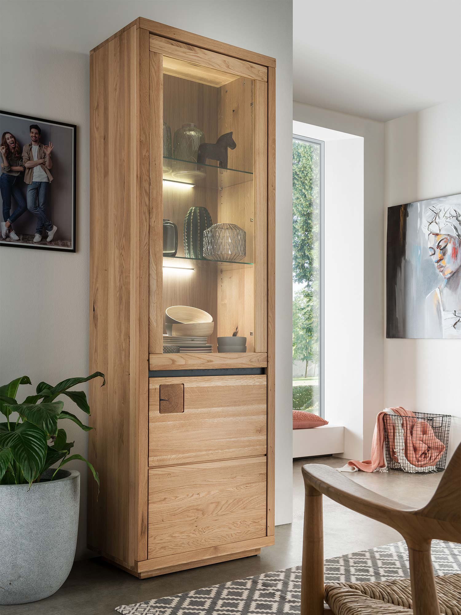 Witryna dębowa z oświetleniem LED w nowoczesnym wnętrzu